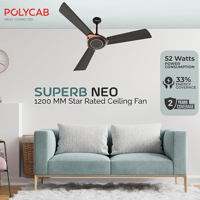 Polycab Superb Neo Star Rated, 1200mm Ceiling Fan For Home | High Speed & Air Delivery | Saves Up To 33% Electricity, 100% Copper, Rust-Proof Blades, 52 Watt | 2-yr Warranty【Jaco Bean Bronze Gold】